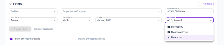 A new “Amount Type First” view has been added to property comparison reports and is now set as the default. This view groups data by amount type (Actual, Budget, Forecast) first, making it easier to compare different financial perspectives across properties.