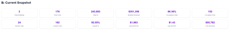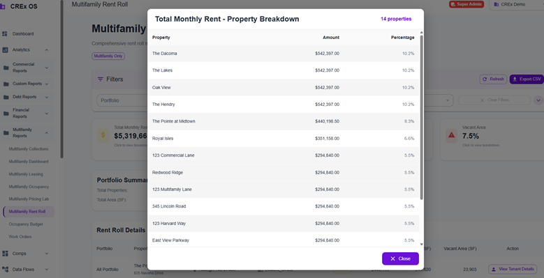 Summary cards within Collections, Dashboard, Leasing, and Rent Roll modules are now interactive. Clicking a summary card allows users to drill directly into property-level details, making it easier to move from high-level insights to specific property data and improving overall navigation efficiency.