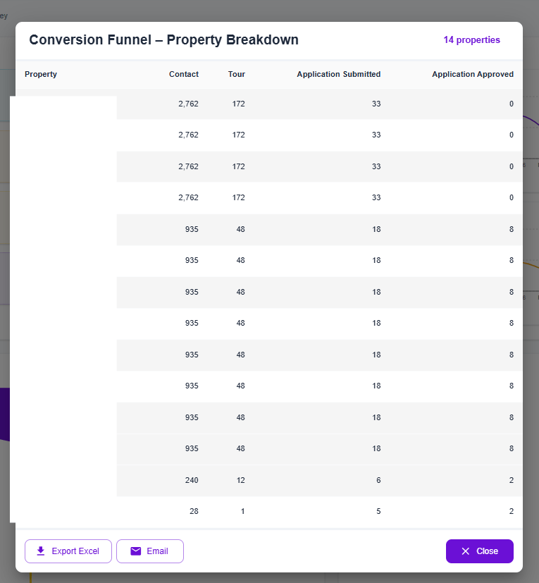 Multifamily lease reports now support property-level breakdowns. Users can drill into lease data directly from the Conversion Funnel and Lead Source Analysis views. A new property breakdown dialog provides detailed, property-specific leasing insights.