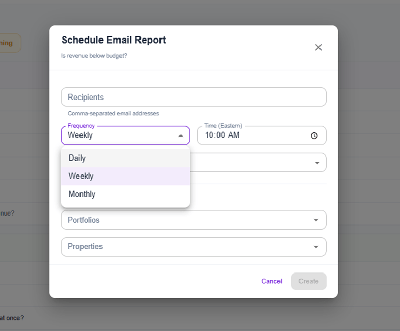 The Insights page has been redesigned with a new Smart Insights Panel powered by an AI-driven insight engine. The platform now automatically generates data-driven insights and supports scheduled insights with email notifications. New interactive charts—including Loss to Lease, Portfolio Snapshot, Rent Growth, and Rent to Market—provide deeper visibility into performance trends. A last-updated indicator and improved GPR logic ensure data accuracy and transparency.