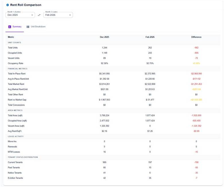 A new Rent Roll Comparison card enables side-by-side analysis of rent roll data across two time periods. The Summary view highlights key differences in metrics such as occupancy, rent, and lease activity, while the Unit Breakdown view provides detailed unit-level comparisons grouped by property. This helps teams quickly identify rent changes, turnover, and occupancy trends.