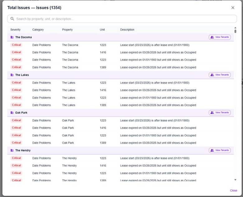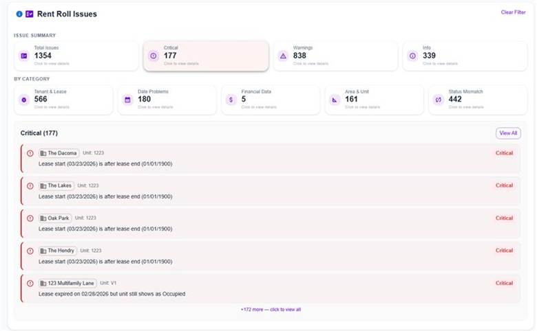 A new Rent Roll Issues card has been added to the Multifamily Rent Roll report. This feature automatically scans rent roll data and flags issues across categories such as Tenant & Lease, Date Problems, Financial Data, Area & Unit, and Status Mismatch. Issues are classified by severity (Critical, Warning, Info), and users can view them inline or in a detailed dialog grouped by property, with search functionality for faster investigation.