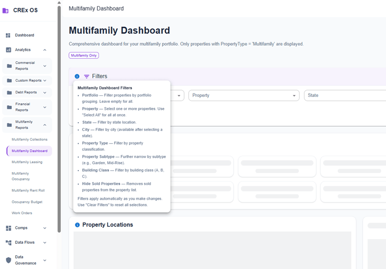 Added 77 contextual tooltips across more than 20 pages, covering Data Governance, Comparables, Financial, and Multifamily modules. These tooltips provide inline explanations for fields and metrics, helping users better understand data without leaving the page. Icons have been repositioned for a more consistent and scannable layout.