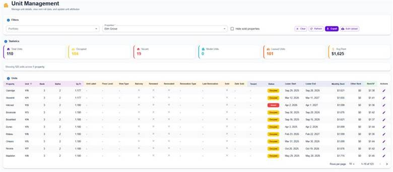 Two new columns—Sold and Date Sold—have been added to the Unit Management table. These fields allow users to track unit sale status directly within the data governance interface, improving visibility into asset lifecycle and unit-level changes.
