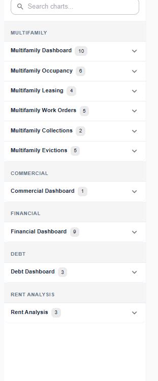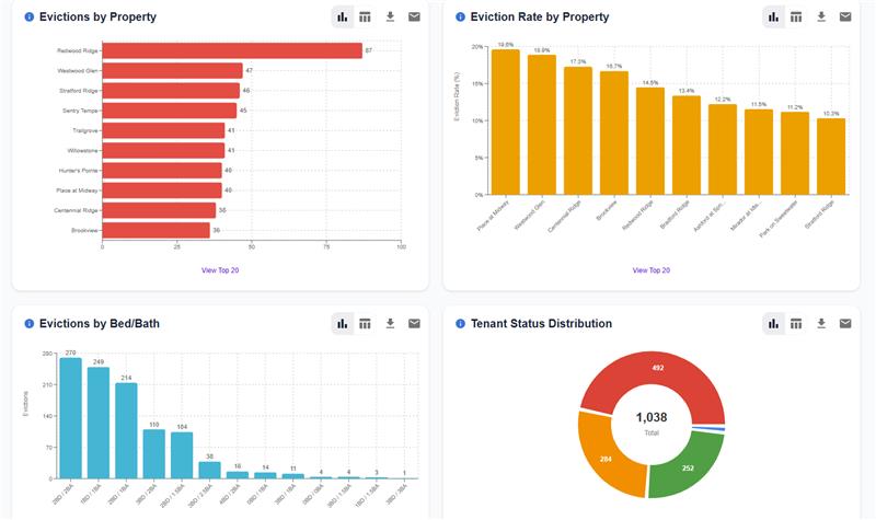 A new Evictions report has been added to the Multifamily dashboard, featuring five interactive charts that track eviction trends, status breakdowns, and property comparisons. Users can filter by property, date range, and status, and explore detailed data through a sortable table view.