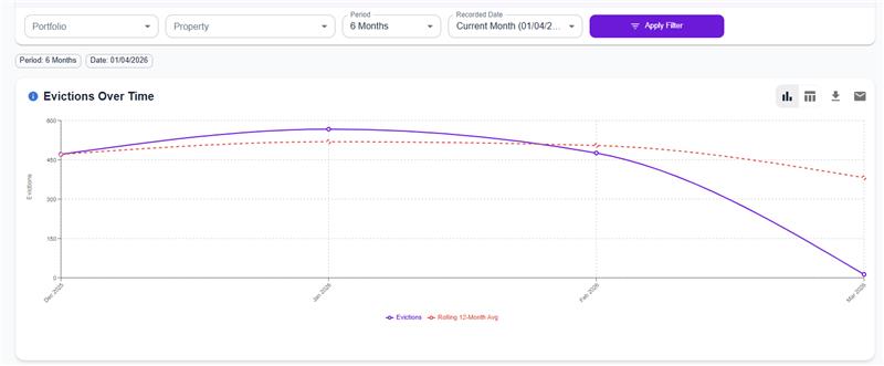 The Evictions report now supports drill-down functionality, allowing users to click on chart elements to explore underlying data. Filter chips provide a clear visual summary of active filters, and backend optimizations improve performance across large datasets.