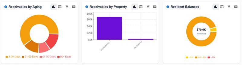 A new Resident Balances widget breaks down outstanding balances into bands (< $1K, $1K–$3K, > $3K) with a visual donut chart. Users can switch between chart and table views, export data, email reports, and drill down to tenant-level details.