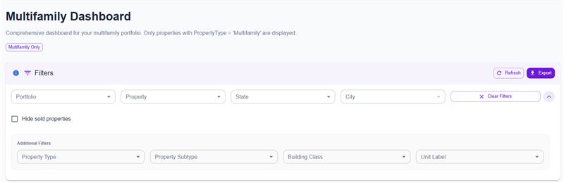 Users can now filter Multifamily dashboard data by unit labels, enabling more granular segmentation and analysis based on custom classifications.