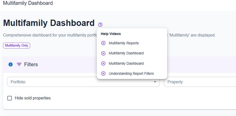 Help icons have been added across onboarding, financial, and multifamily reporting pages. Each icon opens a dropdown of relevant walkthrough videos, providing quick access to guidance without leaving the page.